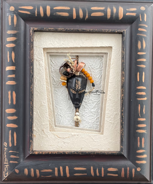 hand made art using african mask buttond handmade paper recycled paper and othe mixed media